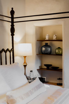 El encanto de esta habitación reside en sus detalles arquitectónicos preservados, como las históricas repisas incrustadas en los gruesos muros. Su hermoso ventanal conecta directamente con la calma del patio central.